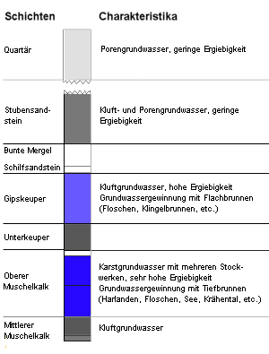 Im Gegensatz zu Brunnen tritt bei Quellen das Wasser direkt an der Erdoberfläche aus. Eine Quelle entsteht dann, wenn eine durchlässige Schicht über einer undurchlässigen liegt und beide an der Oberfläche ausstreichen. Im Raum Sindelfingen ist dies im Unterkeuper und beim höher lagernden Stubensandstein oft der Fall. Der Stubensandstein wird von vielen Klüften und Poren durchzogen, die als Wasserspeicher dienen (Bild unten).