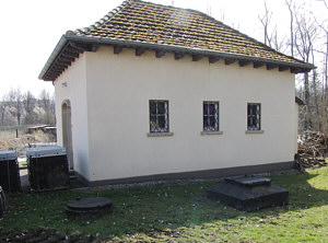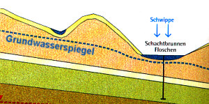 Der Brunnenschacht reicht bis 16 m in den Untergrund. Das Wasser gelangt am Schachtende von unten über Filterkiese in den Brunnen.
