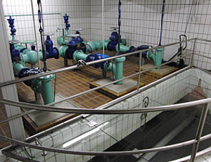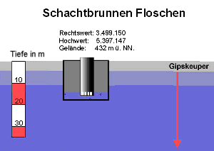 Der Brunnen Floschen ist knapp 16 m tief und war noch bis zum Jahr 2004 zur Gewinnung von Trinkwasser in Betrieb (Bild oben). Er kann für Notfälle innerhalb eines Tages wieder vollständig reaktiviert werden. Seine Ergiebigkeit würde dann über 100.000 Liter pro Stunde betragen. Die Wasserpumpen im Pumpwerk (Bild Mitte) werden von Zeit zu Zeit eingeschaltet, um zu verhindern, dass das Grundwasser im angrenzenden Flöschenwäldchen zu stark ansteigt (Bild und Schaubild unten).