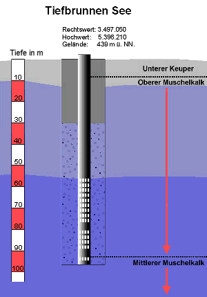 Die Bohrung reicht bis 97 m in den Untergrund. Das Bohrrohr hat in der Tiefe zwischen 55 und 95 m mehrere Filterstrecken und ist großflächig von Filterkiesen umgeben (von 30-97 m Tiefe). Durch diese gelangt das Grundwasser in den Brunnen.