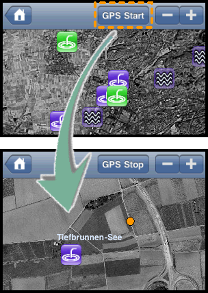 Um einen bestimmten Brunnen draußen im Gelände zu finden, kann die GPS-Funktion verwendet werden. Voraussetzung ist ein Smartphone mit HTML5-fähigem Browser und GPS-Unterstützung. Nach Aktivierung des Buttons "GPS-Start" erscheint ein orangener Kreis, der die gegenwärtige Position anzeigt (Bild unten). Die dauert u.U. einige Sekunden. Die Karte wird dann automatisch so justiert, dass der orangene Kreis immer in der Mitte ist. Eine erneute Aktivierung des Buttons "GPS Stop" stoppt die GPS-Funktion und entfernt alle orangenen Positionsangaben von der Karte.