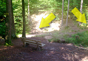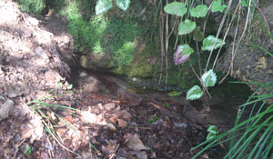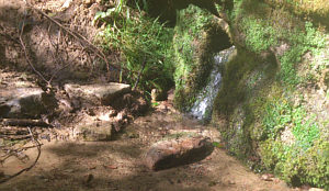 Zur Drei-Brunnenquelle gehören drei frei austretende Quellen im Wald (Bild oben, gelbe Pfeile). Diese können offen (Bild Mitte) oder von Vegetation und Gesteinsschichten verdeckt austreten (Bild unten). Quellen dieser Art kommen immer dort vor, wo tonhaltige wasserstauende Schichten unter durchlässigen Schichten liegen (z.B. Sandsteinen oder von Klüften durchzogene Schichten). Wegen der großen Entfernung zum Stadtgebiet und der geringen Ergiebigkeit werden alle Quellaustritte allerdings nicht zur Gewinnung von Trinkwasser genutzt.