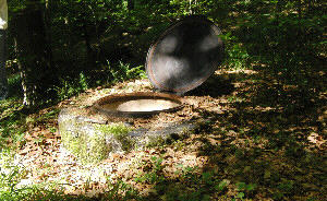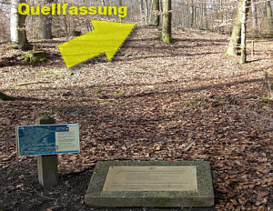 Die Marktbrunnenquelle liegt wenige Meter von einem Waldweg entfernt und ist sehr gut beschildert (Bild oben, gelber Pfeil). Sie ist in einen massiven Betonschacht gefasst (Bild unten). Schon seit 1558 wurde mit einer 3 Kilometer langen Holzleitung das Trinkwasser in die Altstadt von Sindelfingen transportiert. Seit der Landesgartenschau von 1990 versorgt die Marktbrunnenquelle verschiedene Becken im Sommerhofenpark.